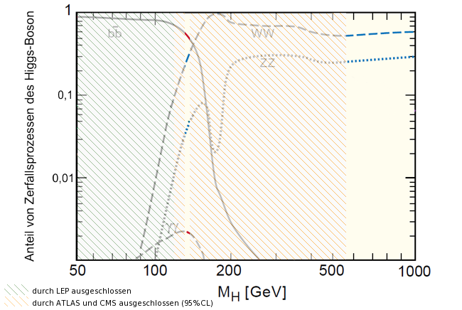 In der folgenden Abbildung, die auf theoretischen Berechnungen beruht und erste experimentelle Ergebnisse der Experimente ATLAS und CMS beinhaltet, sind die Anteile (y-Achse) wichtiger Zerfallsprozesse des Higgs-Teilchens