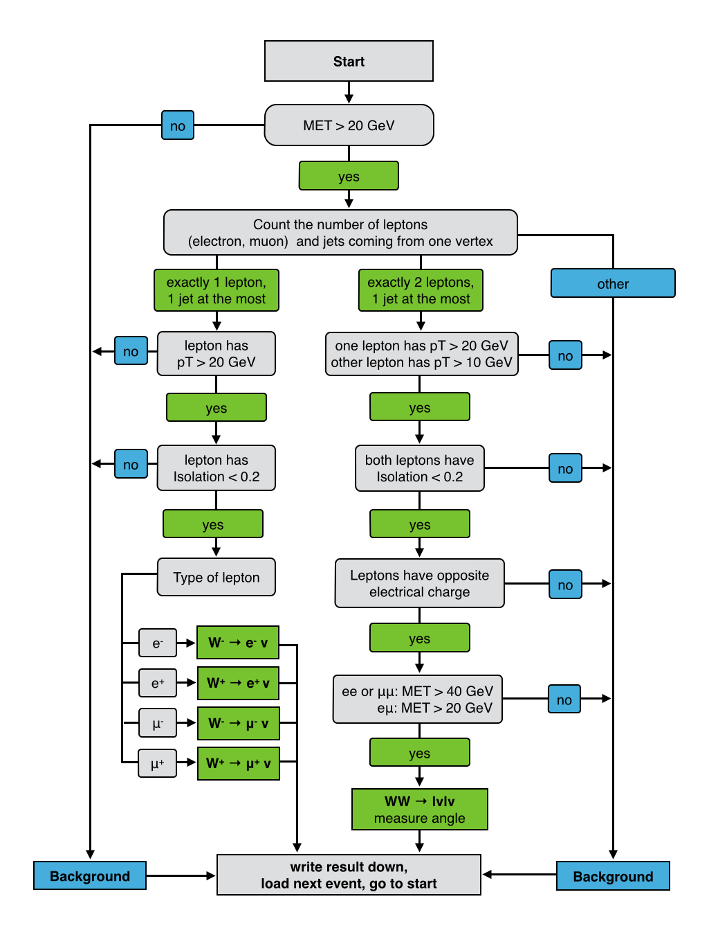 Your task is to distinguish between signal and background events. Here, signal events are events, which produce exactly one W particle. After identifying a signal event, you can determine whether the W particle has decayed into an electron or positron and an (anti-)electron neutrino or into a muon or anti-muon, and a (anti-)muon neutrino. Events with jets, Z particles, and top-quark pairs are background events.