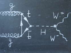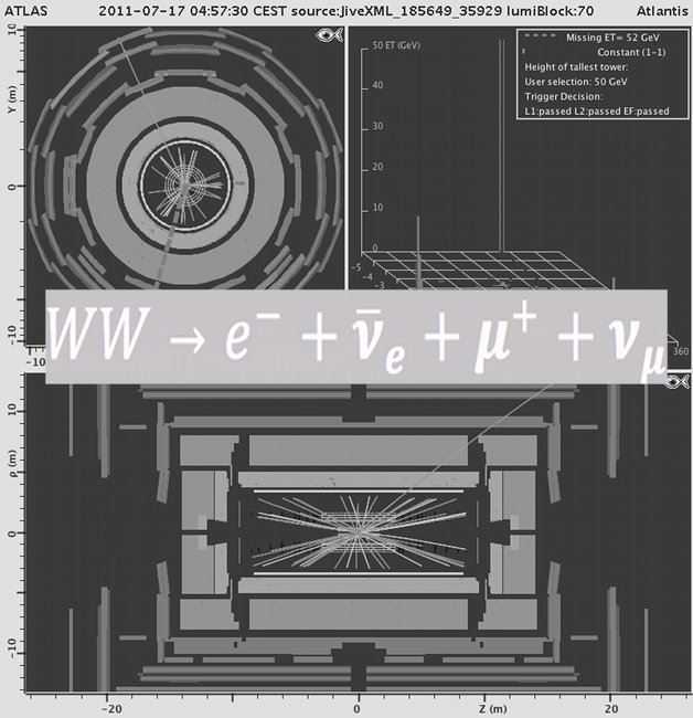 Physicists are calling this decay mode H→WW→lνlν or WW→lνlν short, where l stands for an electron, muon, positron or anti-muon and ν for a neutrino or anti-neutrino.