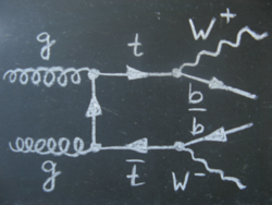 Here are two more Feynman diagrams showing the production and decay of the Higgs particle and one background event (in this case: production of a heavy top quark pair).