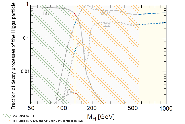 Pay attention to the blue, dashed line (indicated with WW). Since searching the Higgs particle by observing excesses in events with pairs of bottom and anti-bottom quarks (due to the vast background) is difficult, this line tells us: The decay of the Higgs particle into two W particles is the most promising decay mode in the complete and still allowed mass range. These W's have opposite electric charges since the Higgs particle is electrically neutral.