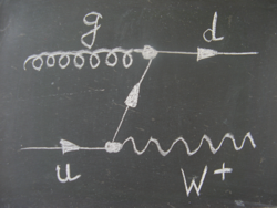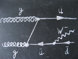 Events with a signature in the detector as illustrated by the last four diagrams will be regarded as signal events in our data samples. Each is an unambiguous indicator of a W particle which has existed for a very short time. All other events have to be categorized as background. Let's have a look at possible background events in this last picture gallery: