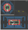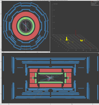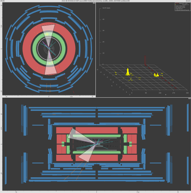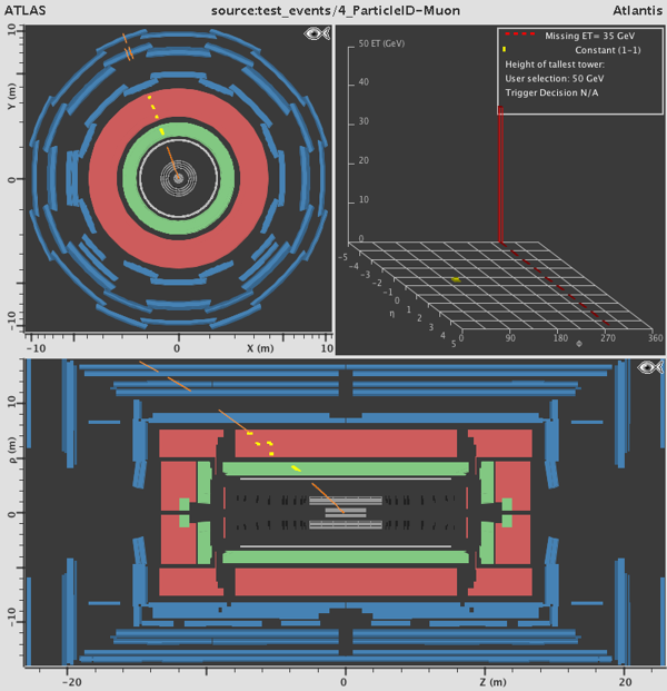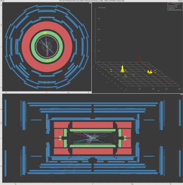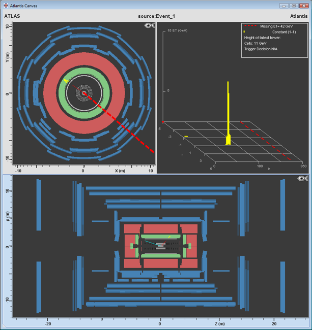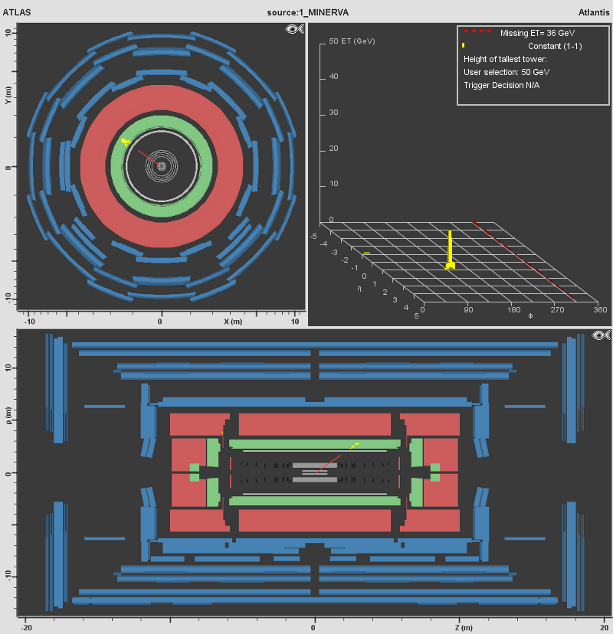 In the ATLAS detector, the missing transverse momentum is determined by the energy deposited in the calorimeters. When there is an imbalance within this energy distribution – which is called missing transverse momentum – this suggests a neutrino which was produced during the collision. There are two ways that this is shown with MINERVA: The missing transverse momentum value is displayed in the lego plot (upper right, look for Missing ET) and a red dashed line is depicted in end view. This line depicts the direction of the energy imbalance. The thickness of the line is a measure for the value of the missing transverse momentum.