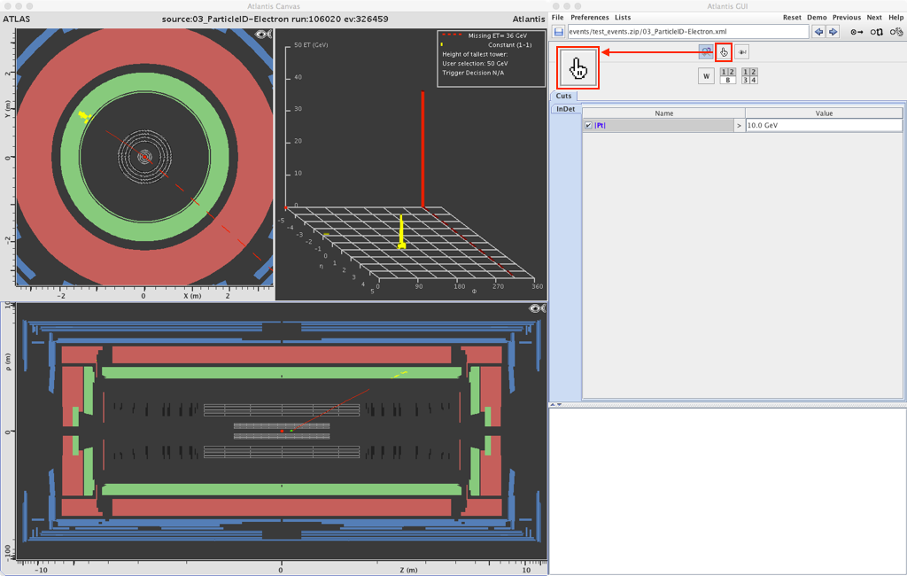 How can you decide whether it is an electron or a positron? In the toolbar of MINERVA you find a hand with a pointed index finger (red frame). By clicking on this option you can choose a track in the event display (again by clicking on it). You will then see information displayed in the lower-right window. This information contains, for example, measured values of space-dependent components of the momentum (Px, Py, Pz) and the transverse momentum (PT). In the following picture you see the information of this window for the selected track.