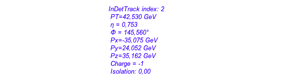This is the info display for the selected track. The first three variables give the transverse momentum (pT), the pseudo-rapidity η and the azimuthal angle φ. The latter two variables give information about the direction of flight of the particle. The next triple of variables (Px, Py, Pz) represents the same information but in cartesian coordinates. Next is the electric charge of the particle belonging to the selected track (Charge: here -1). “-1” means that the particle is electrically negatively charged. “1” means the opposite: electrically positively charged. We can identify our chosen particle as electron. The last bit of information is the isolation. It is a measure of how well the selected track is isolated from the rest of the event. A value of 0 means that no other tracks are in the vicinity of the selected track and that it is very well isolated. Usual values for well isolated tracks range from 0 to 0.3.