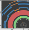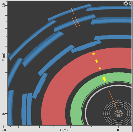 In this event display one sees a track (orange) in the inner detector, small energy depositions in both the electromagnetic as well the hadronic calorimeter (both displayed by little yellow boxes inside the light-green and red structures), and small tracks (orange) in the muon chambers. It is a muon (or an anti-muon), the only particle that goes through the whole detector and thereby leaves signals in all shells.