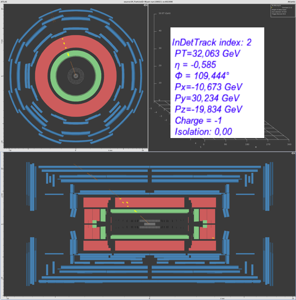 Muon or anti-muon? The same procedure that we described in the electron/positron section provides the result: In this event display, a muon is pictured (charge: -1).