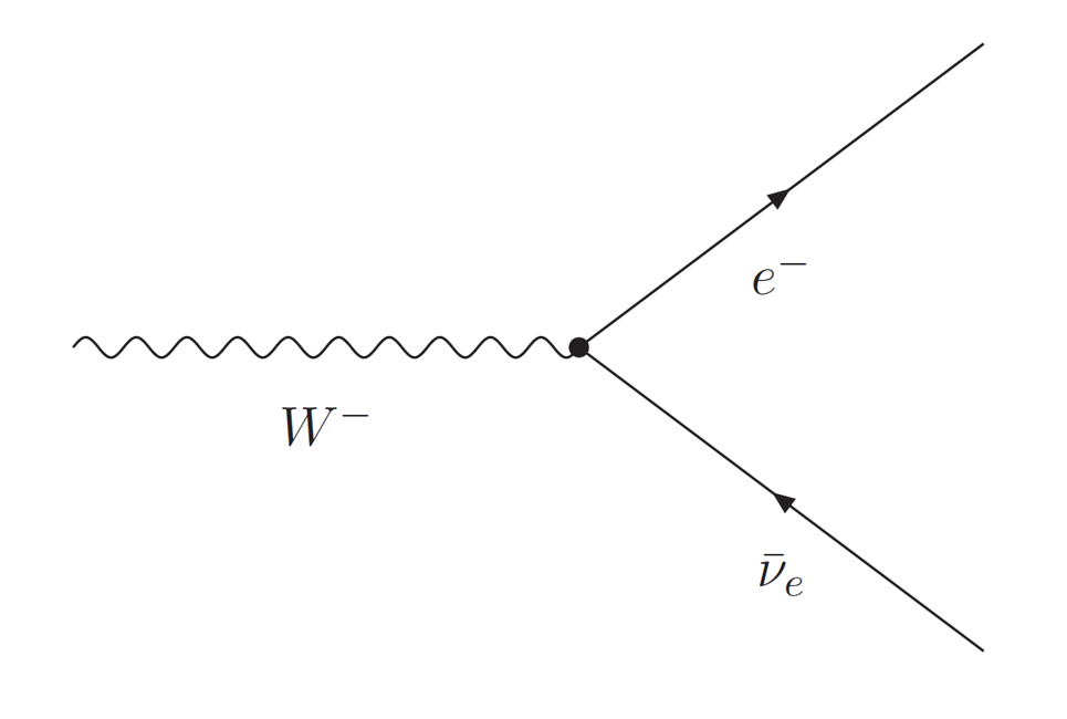 Here the W- boson is produced in a collision between a gluon (g) and a down quark (d) and decays to en electron and an anti-neutrino. This is not the only way a W- boson can be produced and decay, there are many more!