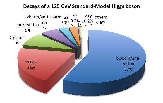 Standardmodellen sier ikke hvor tungt Higgs-bosonet er, men for en gitt Higgs-masse, forutsier den hvor ofte Higgs-bosonet blir produsert i kollisjoner mellom partikler og hvordan det henfaller til kjente partikler. Diagrammet under oppsummerer hvor ofte et 125 GeV tungt Higgs-boson henfaller til forskjellige kjente partikler.