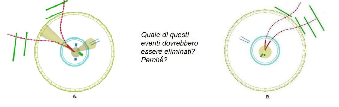 Documentazione CMS Masterclass. Con questo esercizio potrai studiare decadimenti di coppie di muoni, per determinare quali sono candidati di J/Ψ (un mesone composto da una coppia di quark charm-anticharm) e poi creare un istogramma della distribuzione di massa per gli eventi che passano nel "trigger degli studenti." Riconoscere un candidato J/Ψ Quando una particella J/Ψ decade, tipicamente produce una coppia di muoni. Guarda ATTENTAMENTE i due eventi nelle figure sotto. Vedi una coppia di muoni (tracce rosse) in uno o in entrambi gli eventi? Potrebbero essere candidati di J/Ψ? Si tratta di una chiara evidenza? Sei sicuro della tue affermazioni?