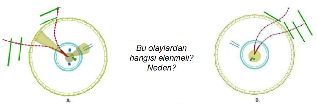 CMS Masterclass Documentation sayfasını ziyaret ediniz. Bu çalışmada J/Ψ (tılsım-antitılsım mezonu) adaylarına karar verebilmek için muon çifti içeren bozunumları inceleyecek ve “sizlerin kıstaslarını” sağlayan bu olayların kütle hesabını yapıp bir histogram oluşturacaksınız. Arkaalan Bir J/Ψ parçacığı bozunduğunda genelde bir muon-anti muon çifti oluşturur. Aşağıdaki olaylara dikkatlice bakın. Sizce bunlardan herhangi birinde ya da ikisinde de muon çiftine (kırmız izler) dair bir kanıt var mı? Bu olaylardan herhangi biri bir J/Ψ adayı olabilir mi? Bu kanıt sizce zayıf bir kanıt mı, yoksa güçlü bir kanıt mı? Vardığınız sonuca güveniyor musunuz?