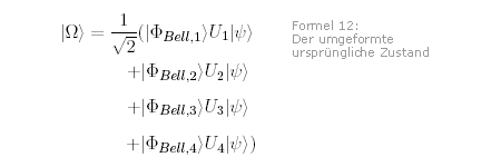 Damit ist der unbekannte Zustand von der ersten Position zu dritten gewandert. Wenn wir nun an den ersten beiden Quanten eine Bell-Messung vornehmen, wird einer der vier Bell-Zustände angenommen. Wir müssen dann nur noch einmal die entsprechende Transformation U 1 , U 2 , U 3 oder U 4 auf das dritte Quant anwenden. Und der Zustand des Quants ist teleportiert!